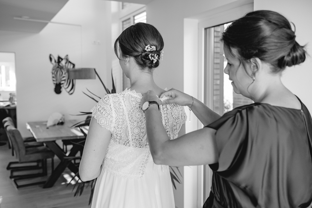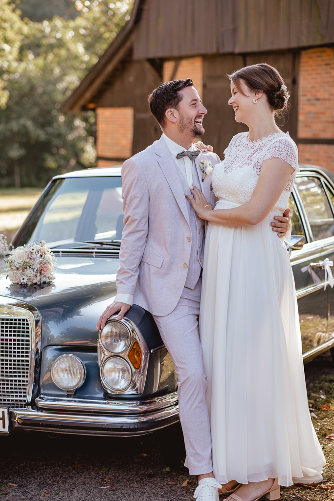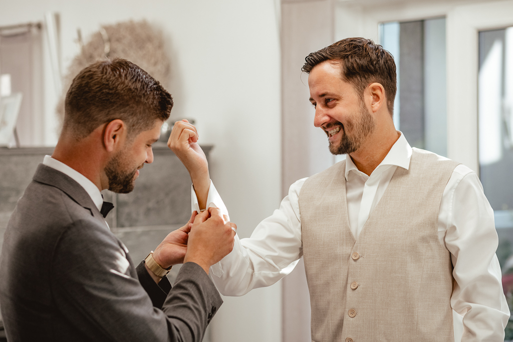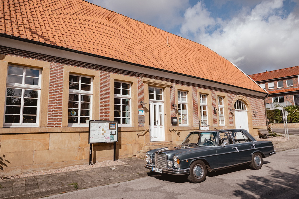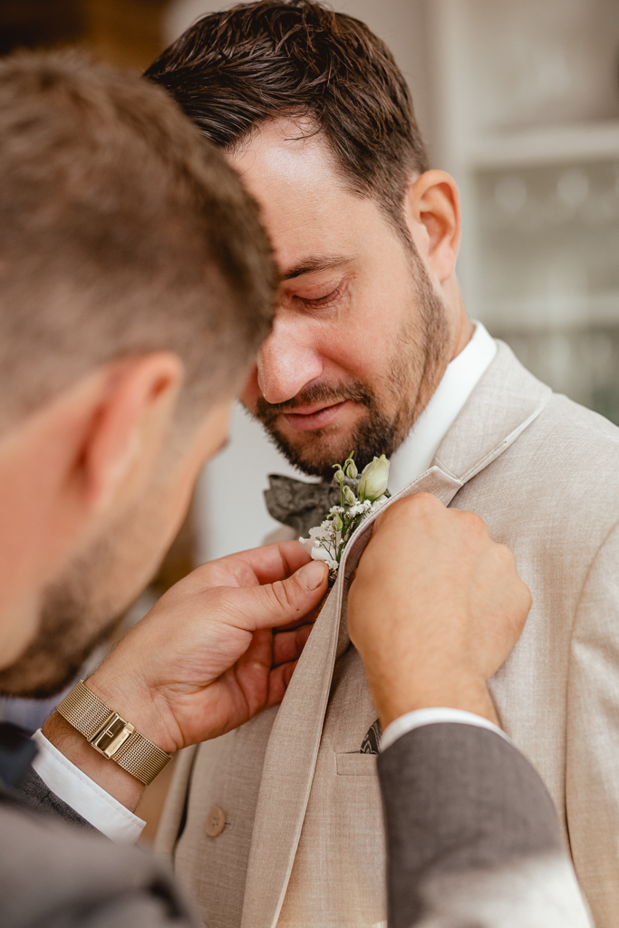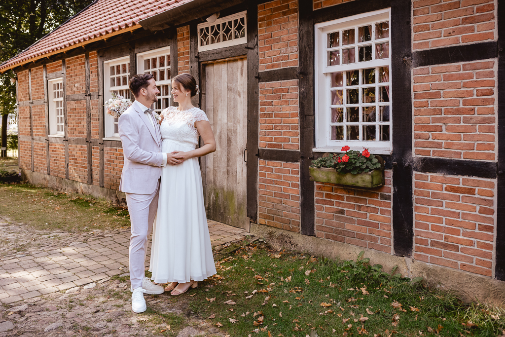 Ich machte mich morgens auf den Weg in’s Emsland, zunächst zum Getting Ready von Rene, der dabei von seinem Trauzeugen unterstützt wurde. Zeitgleich wurde Inga schon zuhause frisiert und geschminkt und war fast fertig als ich dann bei ihr eintraf. Ihre Trauzeugin half ihr in ihr Brautkleid und ihren Schmuck anzulegen. Dann machten wir uns auf den Weg zum Freilichtmuseum. Rene wartete dort schon auf seine Inga.